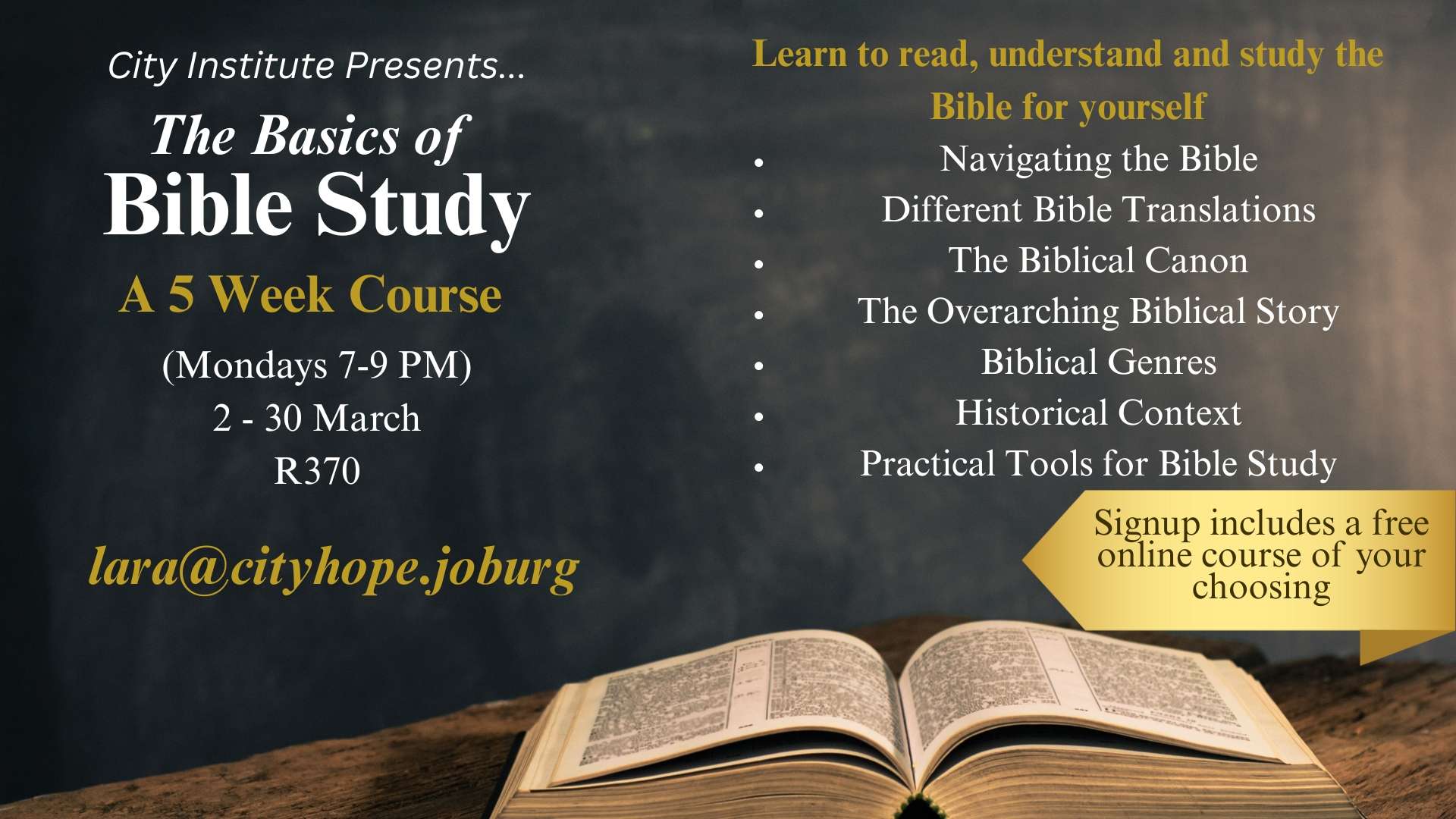 An introductory course for new Christians or those with little Bible knowledge, aimed to orient you in the basics of the Bible. This course is designed help you read, understand and study the Bible for yourself. Includes a free online course on completion. The course runs every Monday night from 7pm-9pm from 2-30 March. Topics […]